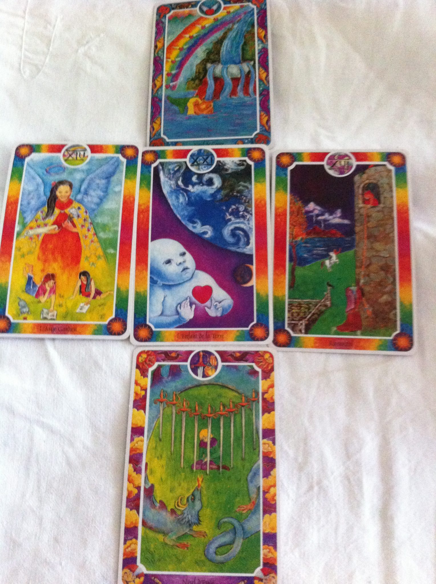Selon moi, juste par l’image, les cartes 1 et 5 sont facilement positives. Dans la deux, il y a une embûche, mais de l’aide de la part du «chevalier», donc moyenne; pour la 3, je ne pourrais pas dire même s’il y a un arc-en-ciel et la 4 négative. C’est tout ce que j’aurais pu en tirer jusqu’à maintenant, mais je trouve ça passionnant.